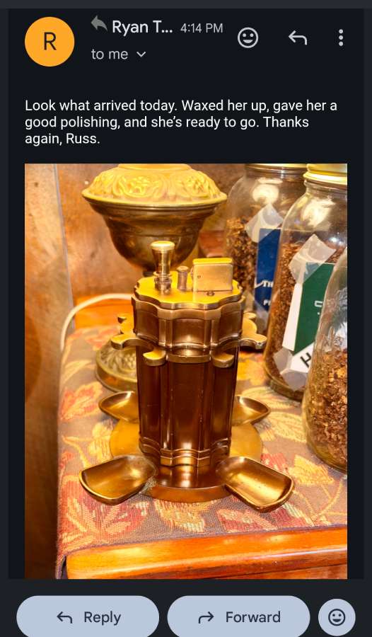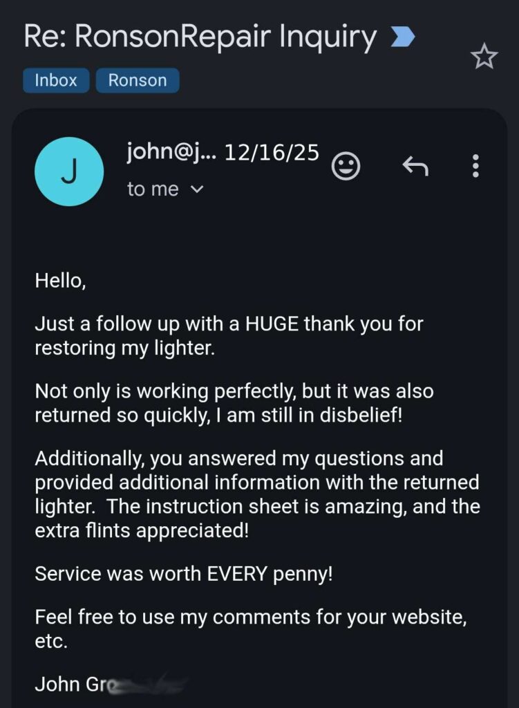 He replied to my email in a very timely manner, succinctly explained his process, then repaired & renovated my lighter within 24 hours of its arrival. He immediately sent me an email with his repair synopsis (including a video), some advice on caring for it going forward, the unexpectedly fair invoice, tracking instructions and the happy farewell, “Other than that, cleaned, lubed, tuned and ready for 80+ more years of use!”