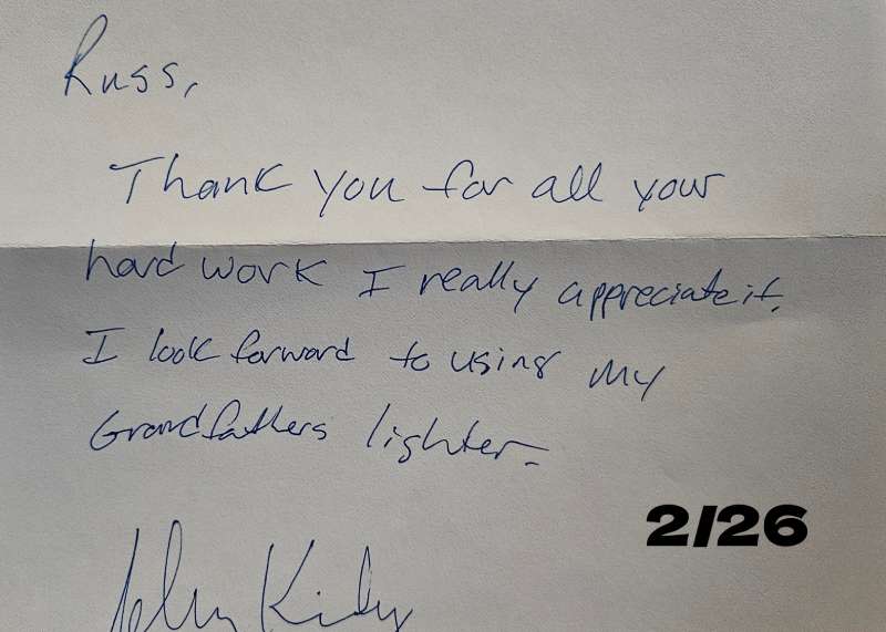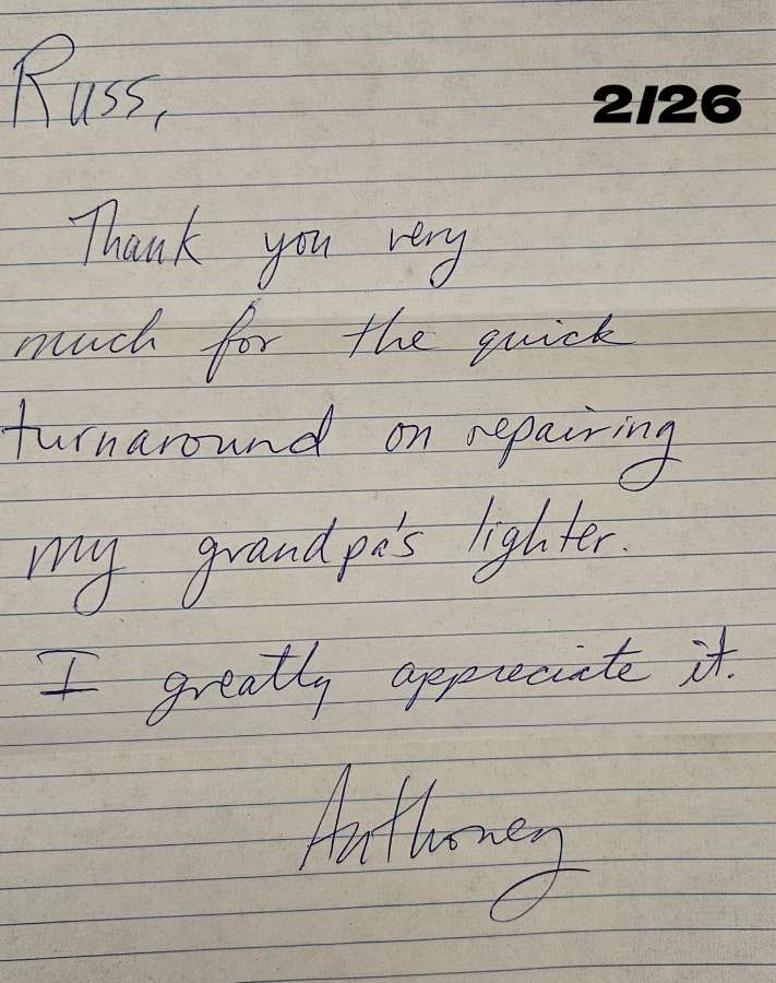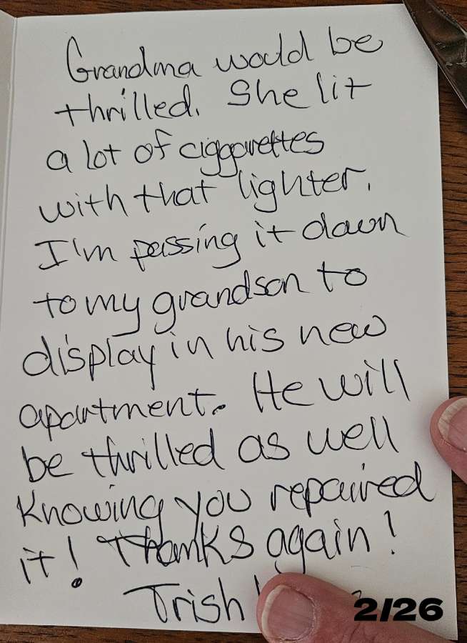 “Bob, muchas gracias por reparar desde tan lejos mis encendedores. Algunos de ellos estaban casi irrecuperables. Eres el numero uno, primero como tecnico y ahora como amigo”.